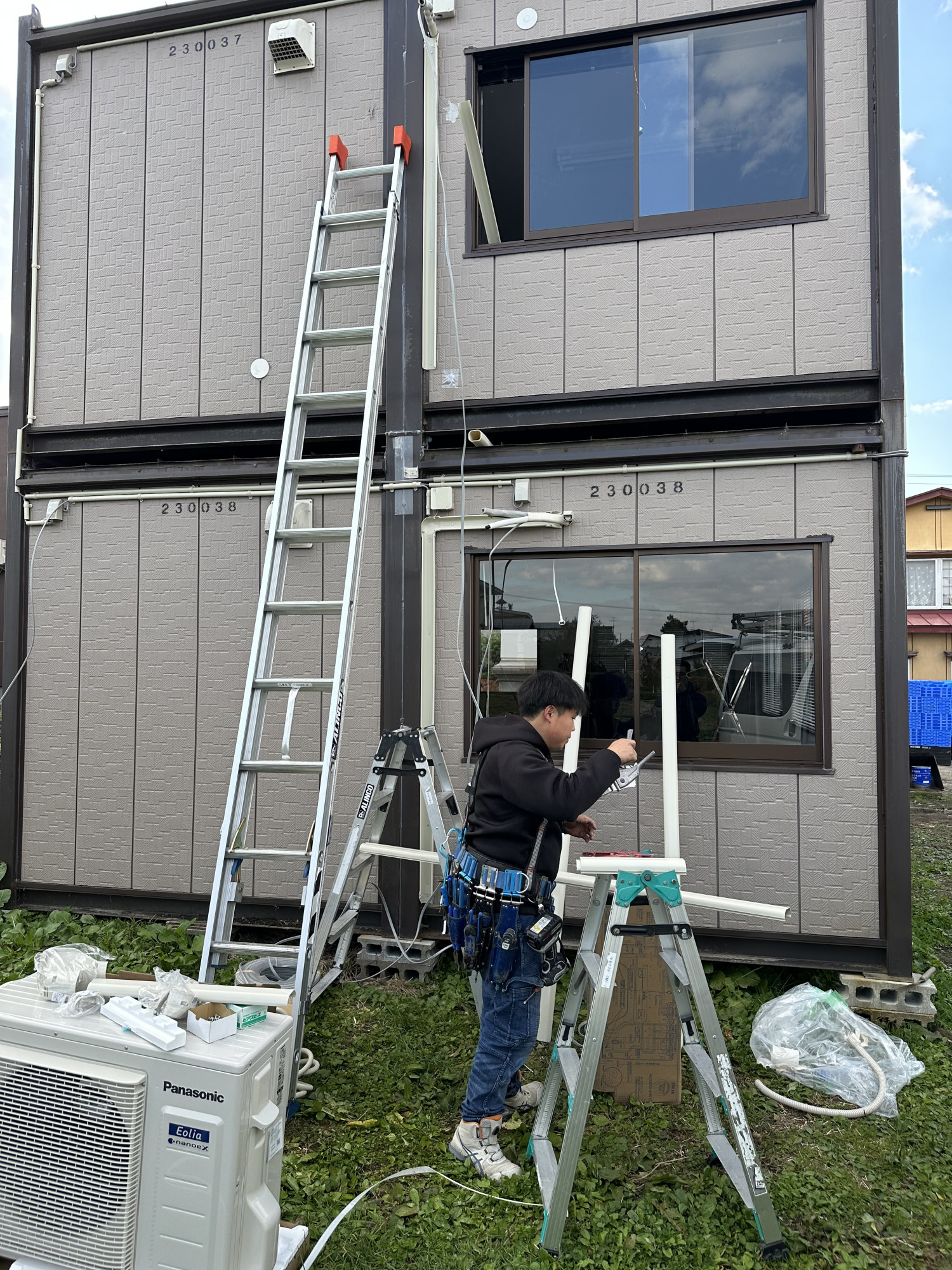 今日は弘前市でのエアコン取付工事です。お客様が購入したプレハブへのエアコン取付工事、電気配線工事、アンペア変更工事というフルセット工事でした。
